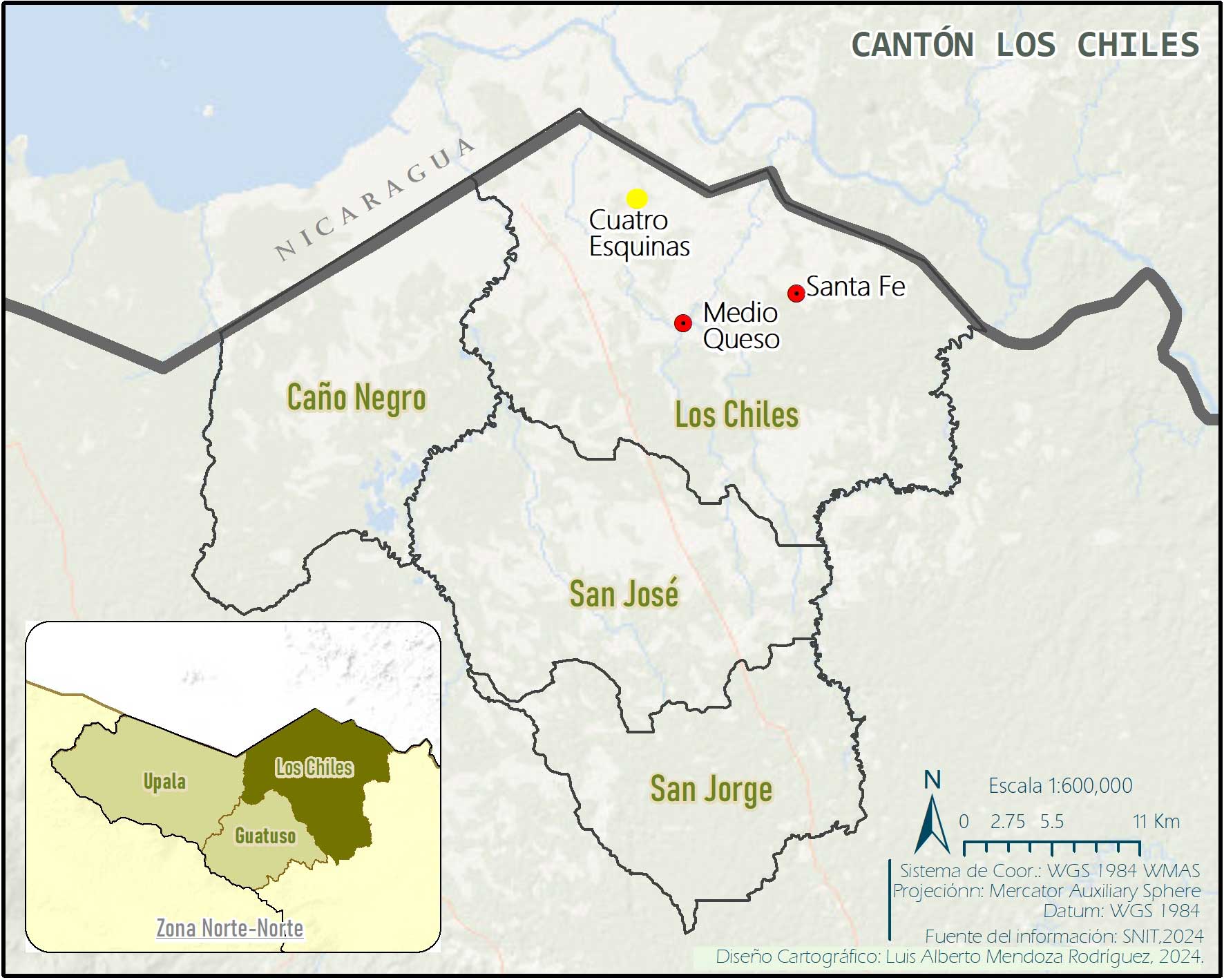 Santa Fe and Medio Queso of Los Chiles are located in the northernmost part of Costa Rica, a few kilometers from the northern border with Nicaragua, which has historically shaped the lifestyles and identities of both communities. The map in Figure 2 illustrates their location.
