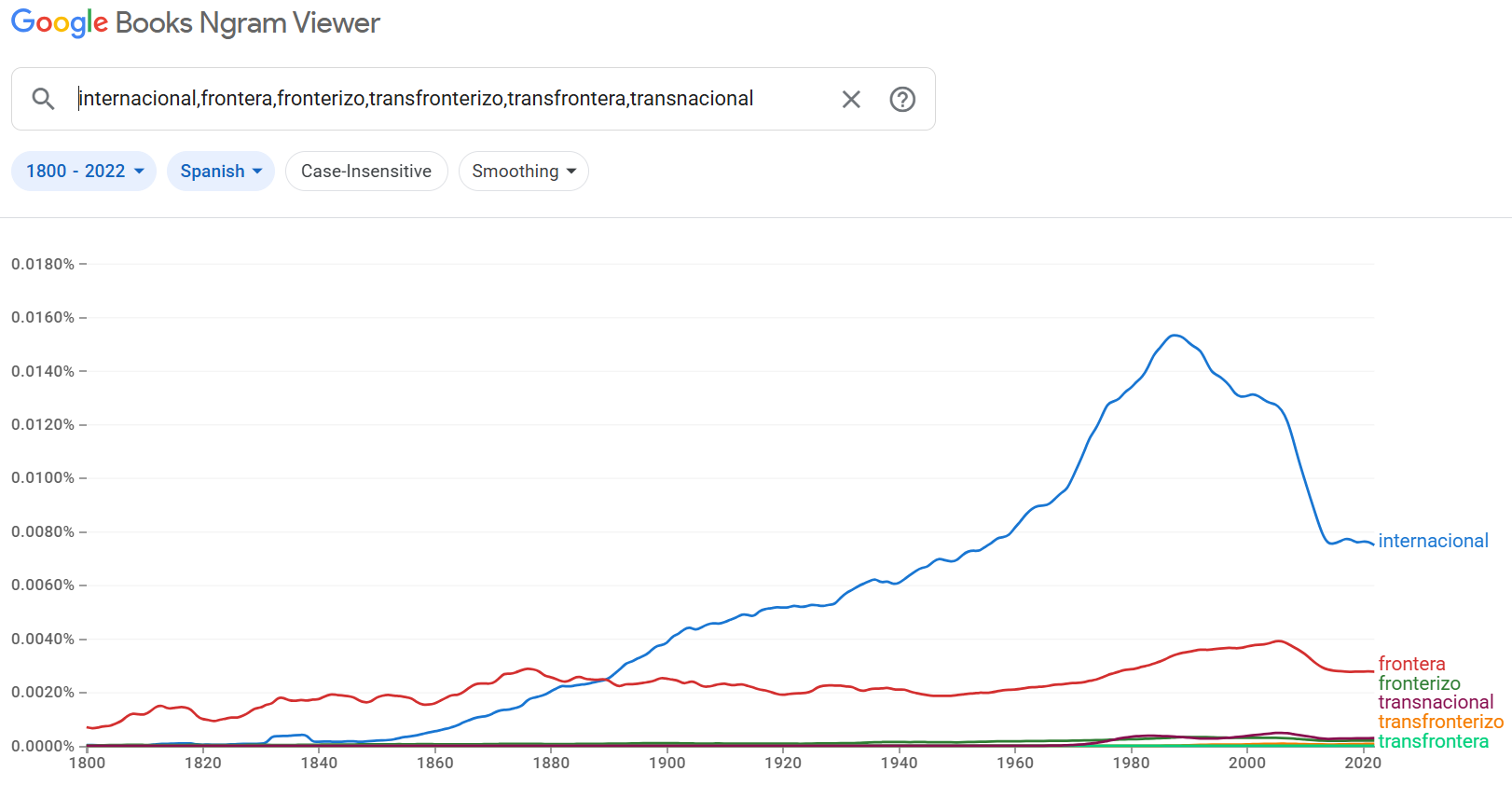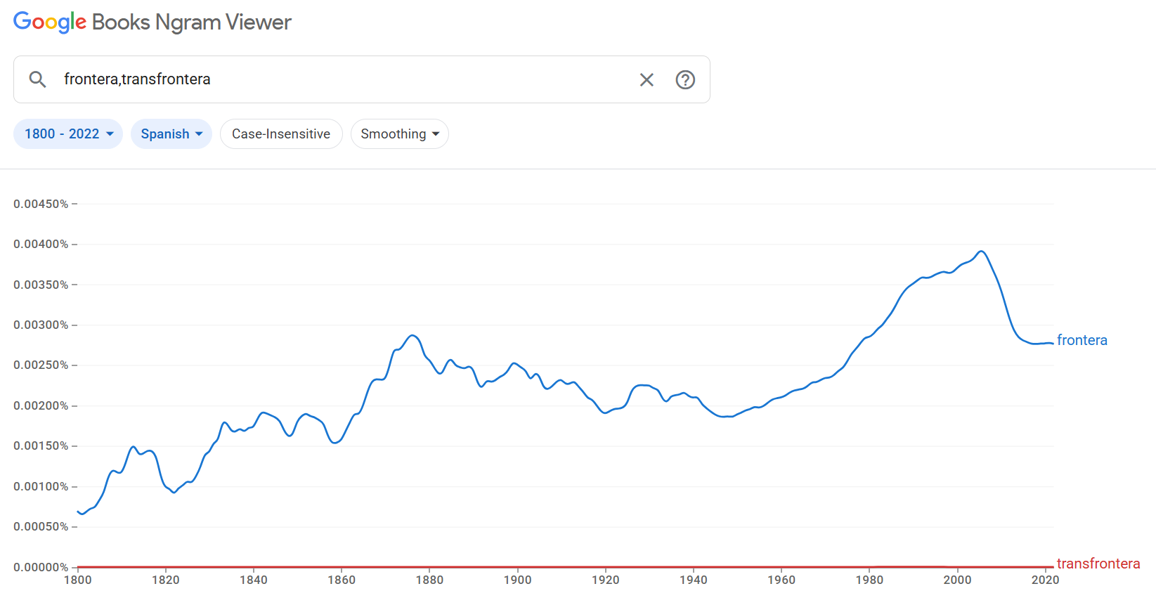 Frequency of use of the terms frontera and transfrontera in the Google Books database in Spanish (1800-2022)