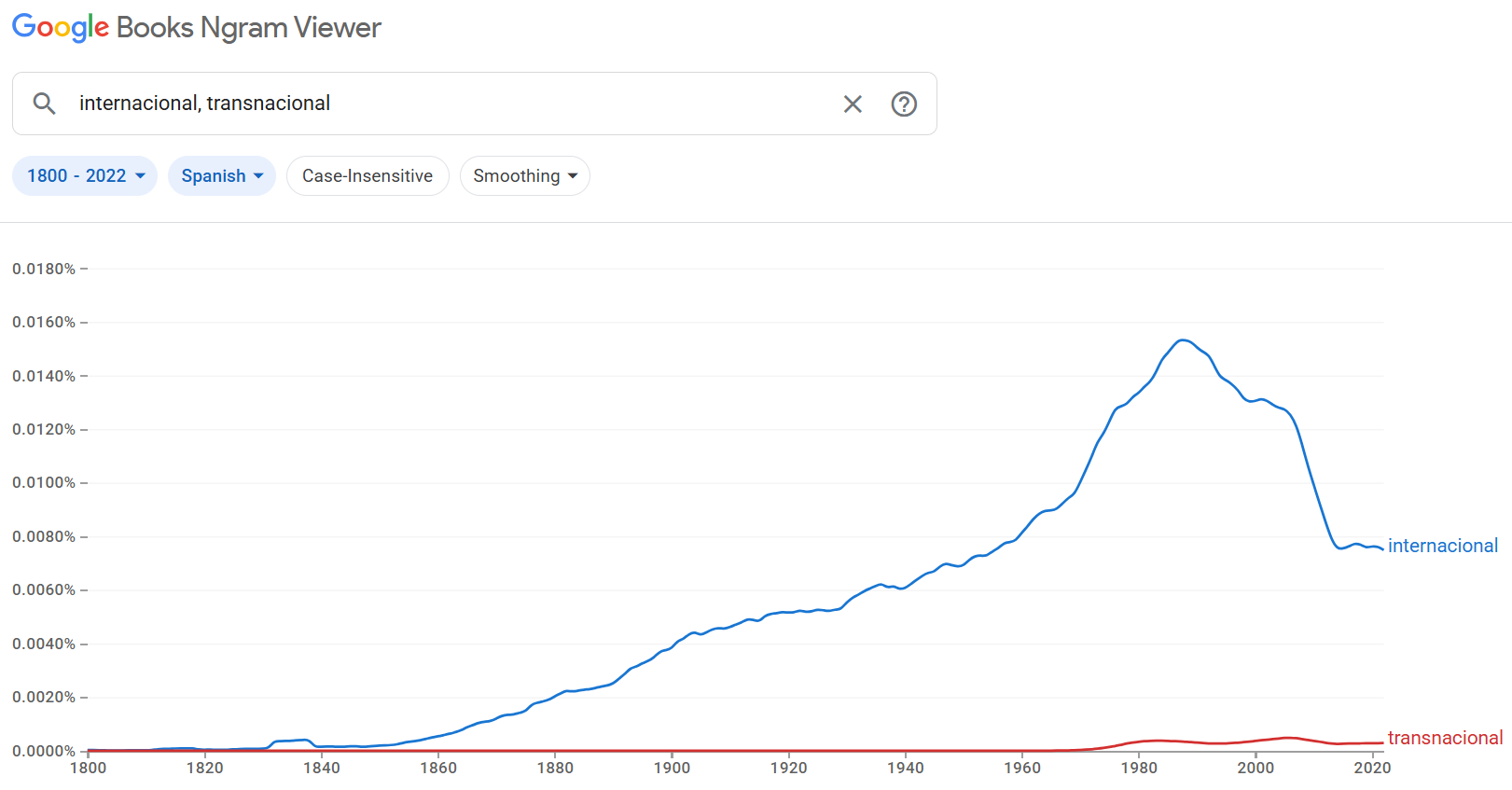 Frequency of use of the terms internacional and transnacional in the Google Books database in Spanish (1800-2022)