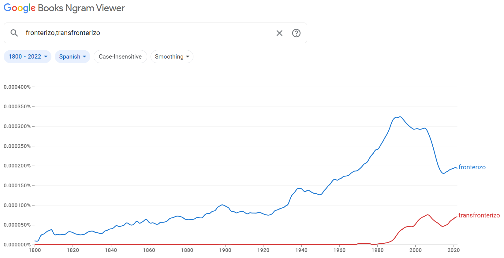 Frequency of use of the terms fronterizo and transfronterizo in the Google Books database in Spanish (1800-2022)
