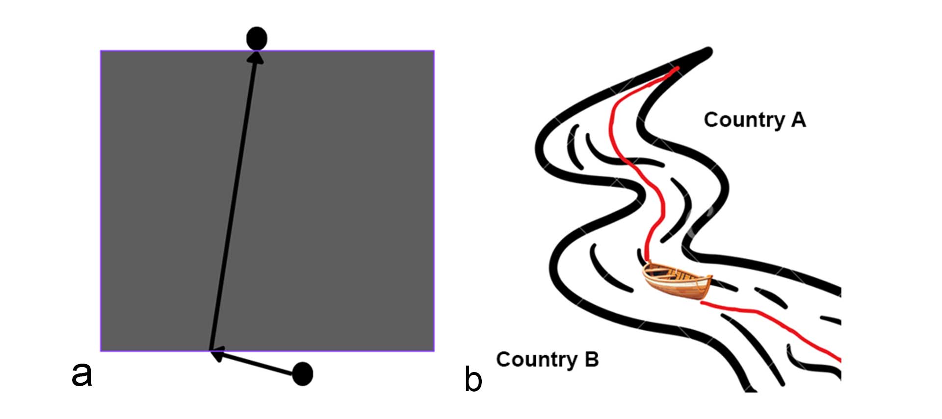 By virtue of the prefix intra-, which means “within” or “inside” (https://dle.rae.es/intra-), as in intramuros (within the walls), the word intrafronterizo arises, which refers to what happens within the border. If it is accepted that the border is not reduced to a line, but is understood as an area, relationships are formed within it. The word intrafrontera could refer to the internal divisions of the border, as a space with interstices. In border complexes, for example, public buildings are located alongside others with restricted access, micro-borders within the border. Some borders are even configured as traffic routes (see Figure 9b), especially in the case of binational rivers or in areas called “dry borders”, where the boundary coincides with a street.