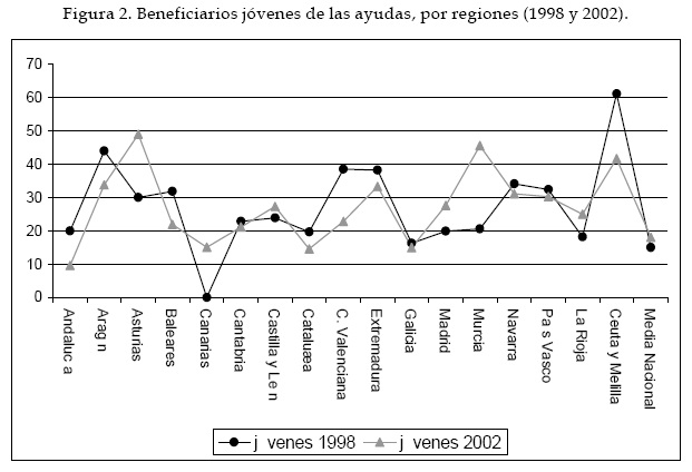 En cuanto a la distribución regional del número de beneficiarios de las ayudas concedidas a través de este programa, podemos comentar que las regiones que experimentan una evolución relativamente favorable entre 1998 y 2002 son Asturias, Canarias, Castilla y León, Madrid, Murcia y La Rioja.