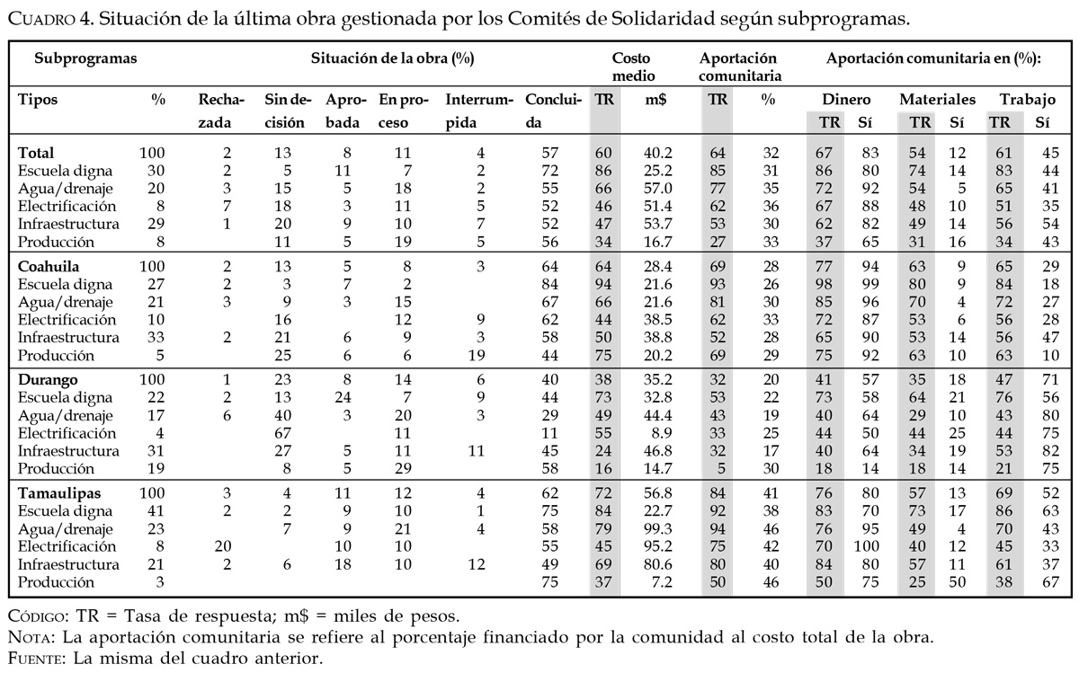 Otros factores que pueden ayudar a explicar la confianza que generaron los Comités como articuladores de la participación en sus comunidades están asociados al trabajo que desarrollaron en el proceso de gestión y ejecución de los proyectos. Aproximándonos en esta dirección, es factible afirmar que otra gran fuente de la legitimidad captada por estas organizaciones se fincó en el compromiso que mostraron sus órganos de dirección en la realización de las tareas ejecutivas y en el seguimiento de las gestiones hasta la conclusión de las obras. Como puede apreciarse en los dos cuadros siguientes, la disposición de las mesas directivas a contribuir como unidades operativas del programa abarcó toda la gama de responsabilidades y actividades técnicas requeridas para la operación de los proyectos (cuadro 3), permitiéndoles al final obtener buenos resultados como entidades financieras y ejecutoras de las acciones emprendidas (cuadro 4). Desde esta perspectiva, las distancias que se observan entre los casos estudiados sugieren la existencia de una relación estrecha entre la capacidad de una sociedad local para organizarse y sus probabilidades de obtener éxito en la gestión de demandas colectivas.