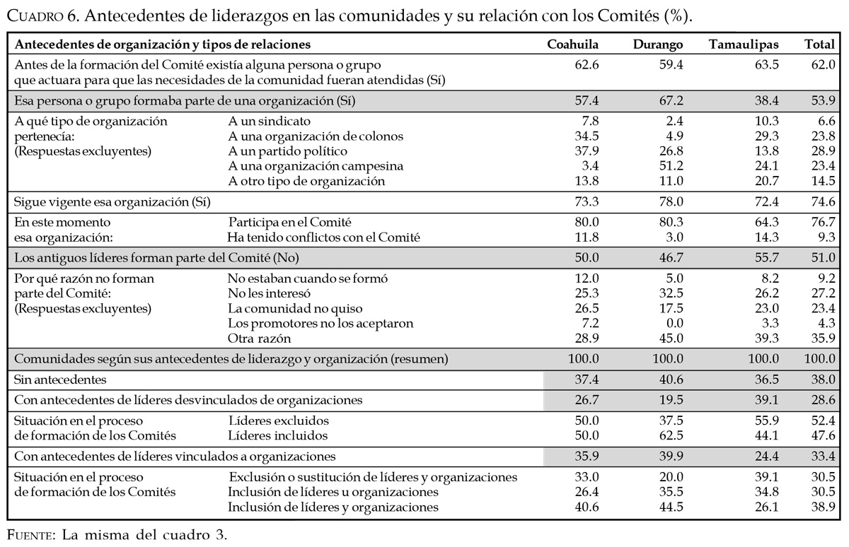 Con lo anterior se podría argumentar que no hay evidencias para fincar responsabilidades a los intermediaros del programa sobre el perfil político de las organizaciones y de los líderes que emergieron; sin embargo, esta afirmación resulta cierta sólo en parte si consideramos que su influencia pudo haberse infiltrado previamente en el momento de la selección. Entre las características asociadas al perfil político de las comunidades beneficiadas sobresale que en casi dos tercios de ellas ya existían líderes comunitarios antes de la constitución de los Comités, de los cuales casi la mitad pertenecían a algún tipo de organización sindical o partidista (cuadro 6). La creación de los Comités en este medio social tuvo algunas implicaciones en la recomposición del tablero político local, sobre todo si se toma en cuenta que alrededor de la mitad de los antiguos líderes fue desplazada por nuevos dirigentes; no obstante, estos procesos de sustitución en su mayoría no se generaron en condiciones de rechazo social o por imposiciones externas. Por otro lado, en las comunidades donde los antiguos líderes formaban parte de alguna organización, en una gran proporción la instauración de los Comités no implicó la desaparición o el desplazamiento de tales agrupaciones ni tampoco derivó en conflictos intracomunitarios; por el contrario, los datos sugieren que en estos casos los Comités tendieron a estructurarse con el entorno organizativo preexistente entablando relaciones de cooperación.