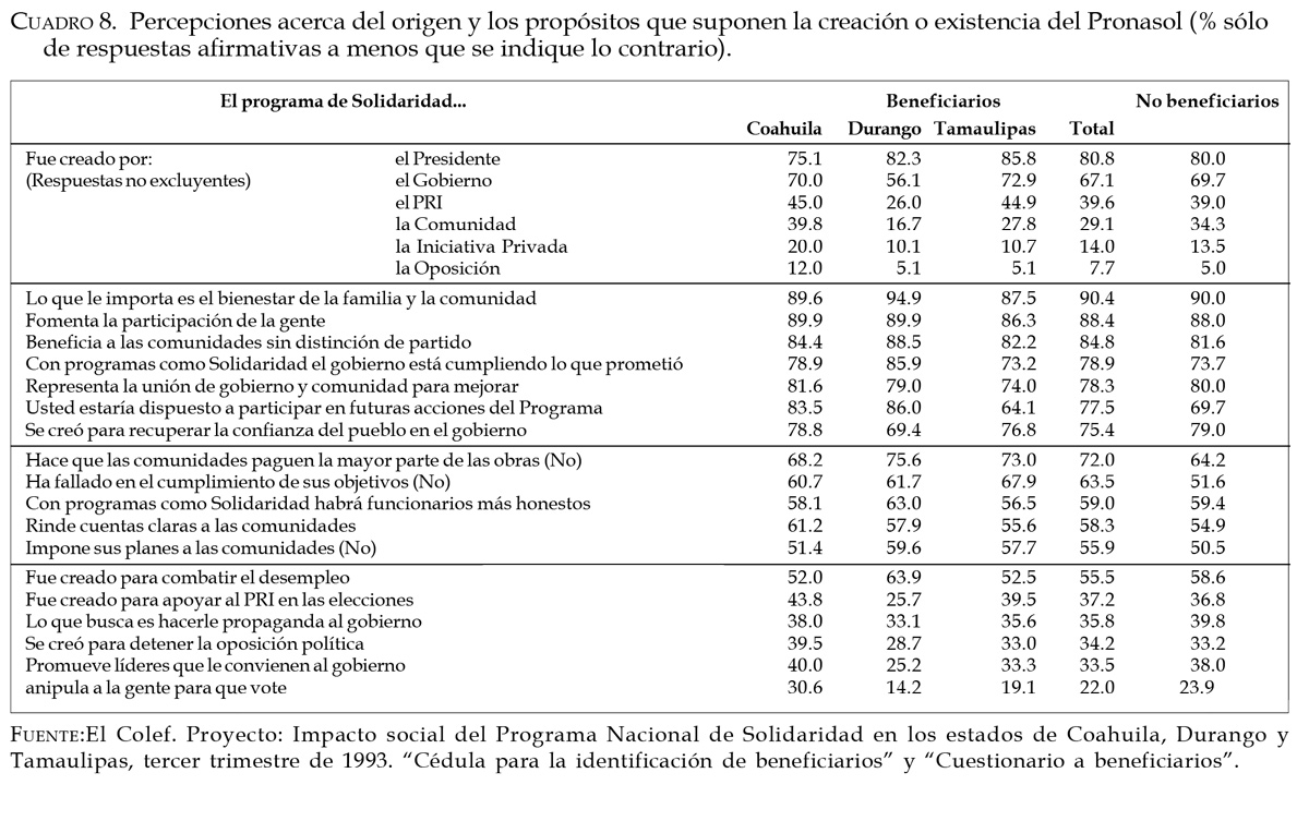 De manera complementaria a estas observaciones, podemos advertir también desde el punto de vista de los beneficiarios y del resto de la población (cuadro 8) el predominio de las opiniones que rehúsan identificar el origen y funcionamiento del Pronasol con propósitos electorales o con políticas discriminatorias en función de preferencias partidistas. Por el contrario, lo que resalta en las percepciones de estos dos subconjuntos sociales es la imagen de un programa preocupado por el bienestar y la participación de la gente, orientado a promover la unión y a recuperar la confianza del pueblo en el gobierno, responsable en la medida en que cumple con lo prometido y con el cual vale la pena continuar trabajando. Lo expuesto hasta este momento indica que no hay elementos suficientes para concluir que Solidaridad intervino de manera sistemática con el fin de ampliar, recuperar o consolidar las relaciones gobiernosociedad empleando esquemas de control corporativo, ni tampoco para afirmar que se hayan utilizado los recursos públicos de manera generalizada con fines electorales específicos. La evidencia en su conjunto ratifica la hipótesis alternativa que planteamos en el párrafo anterior: la mayor parte de los errores cometidos en los procesos de selección tienen su origen en el orden de preferencia que los intermediarios del programa concedieron a sectores sociales no prioritarios en función de su situación económica.